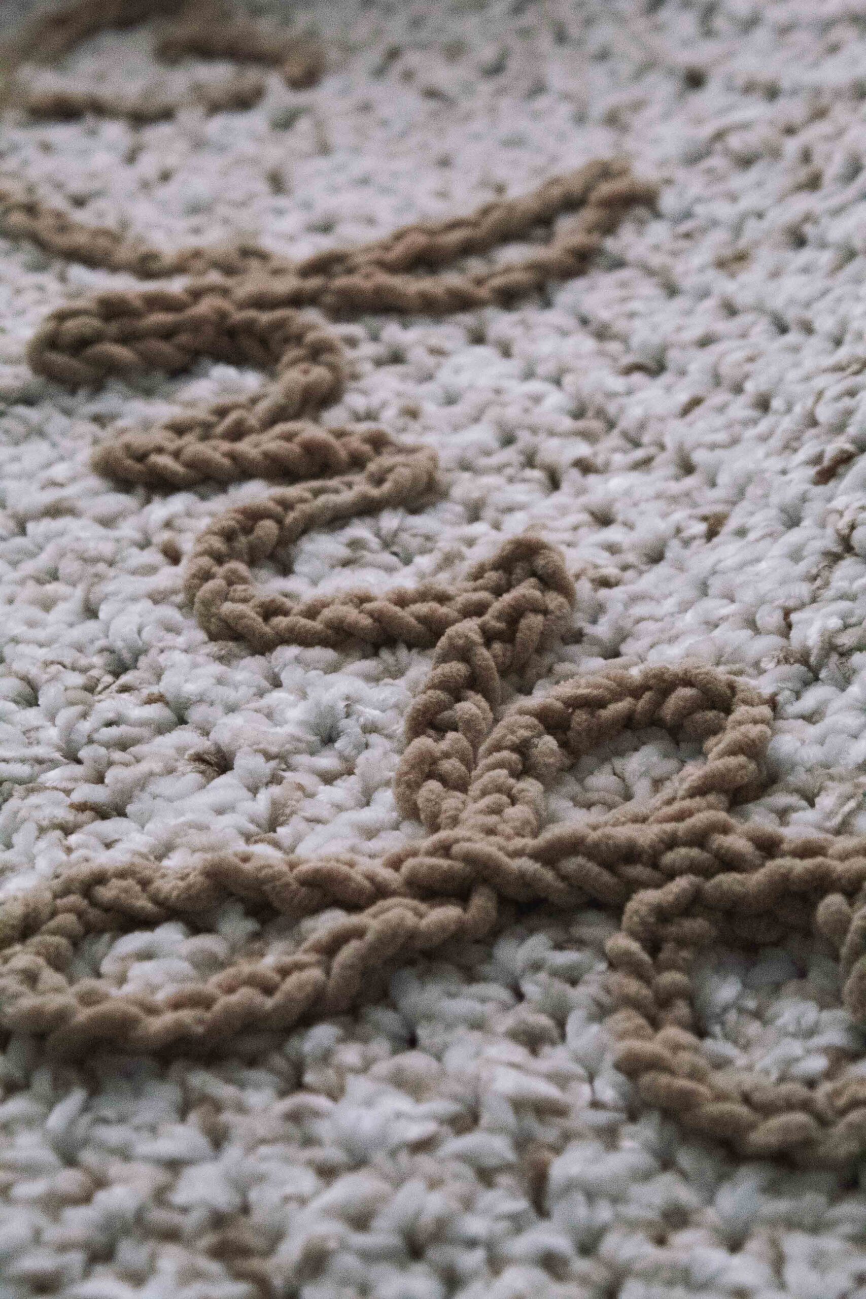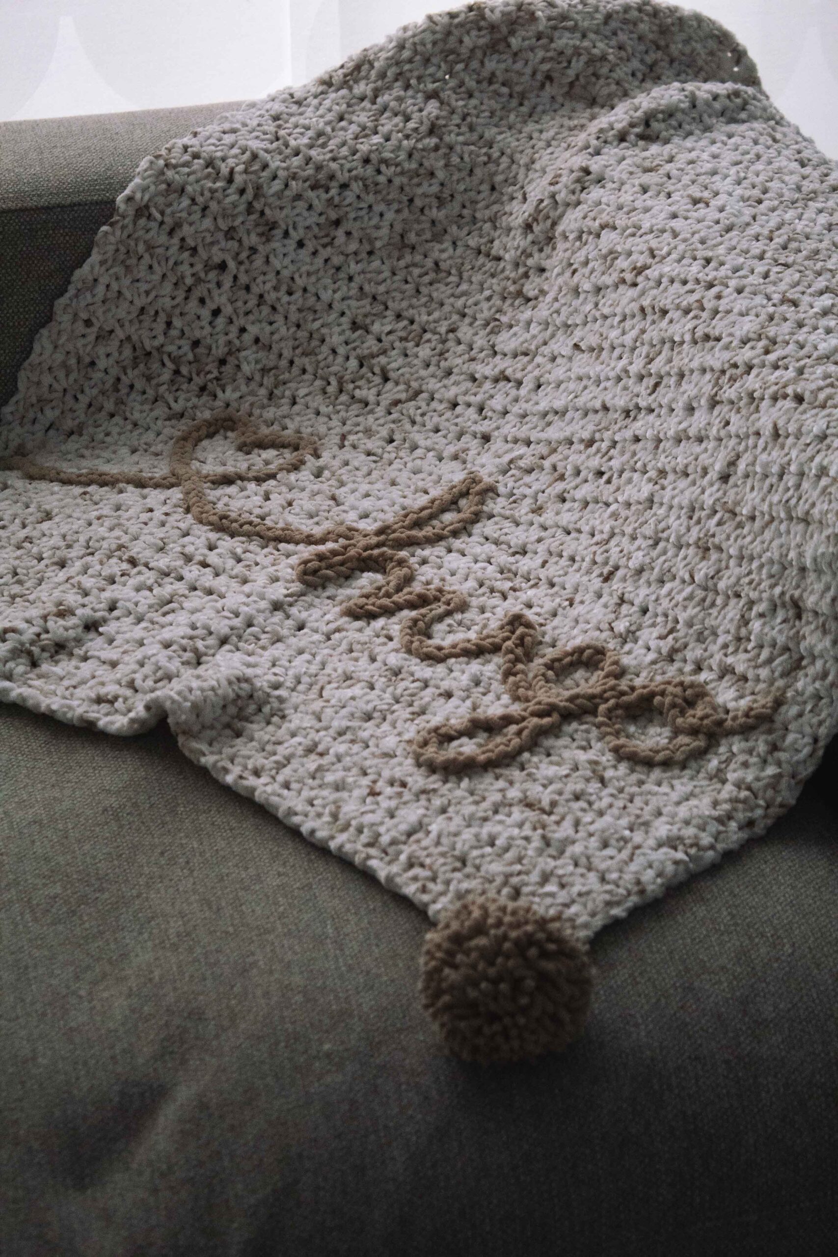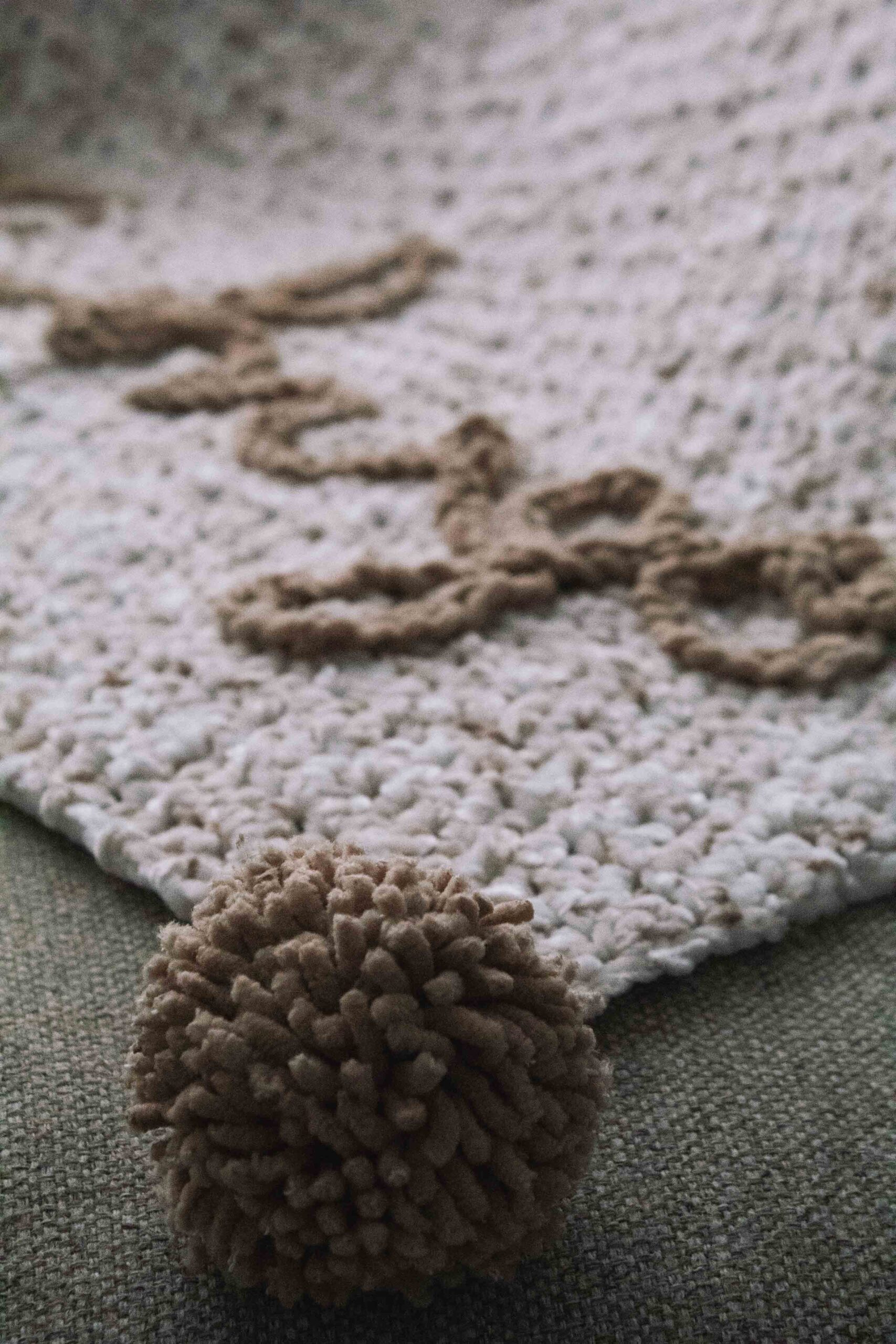 Hacemos una cadena (del largo que necesites) con Caricia Sol y la vamos adaptando al nombre que quieras poner en la manta. Una vez presentada con alfileres, coseremos a la manta con aguja e hilo de coser. Confeccionamos 4 pompones también con Caricia Sol y los unimos a cada una de las 4 esquinas.