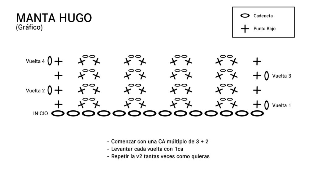 – En este caso, el patrón vamos a comenzarle por el lateral, es decir, haremos tantas cadenetas como queramos que sea de ALTO nuestra manta y daremos tantas vueltas como queramos que sea de ANCHO.