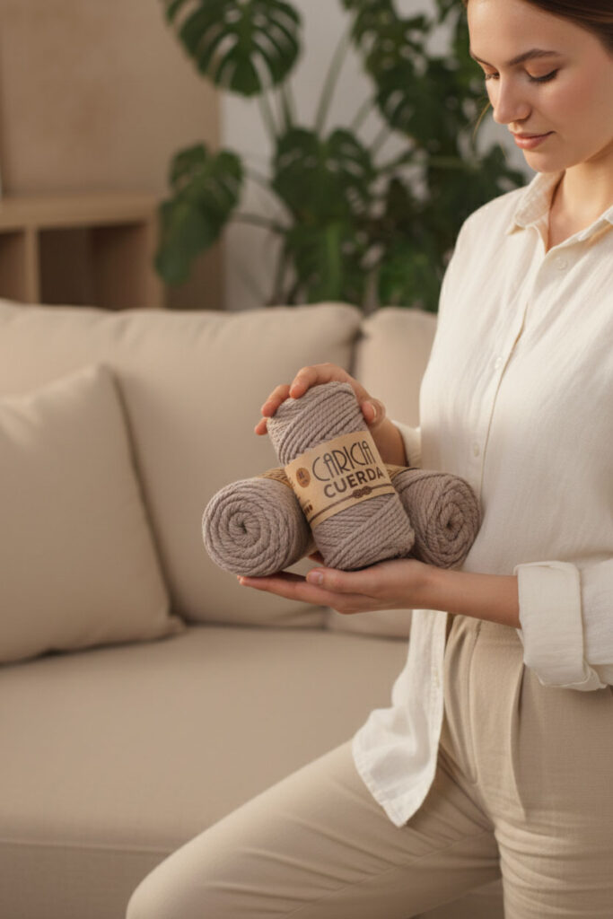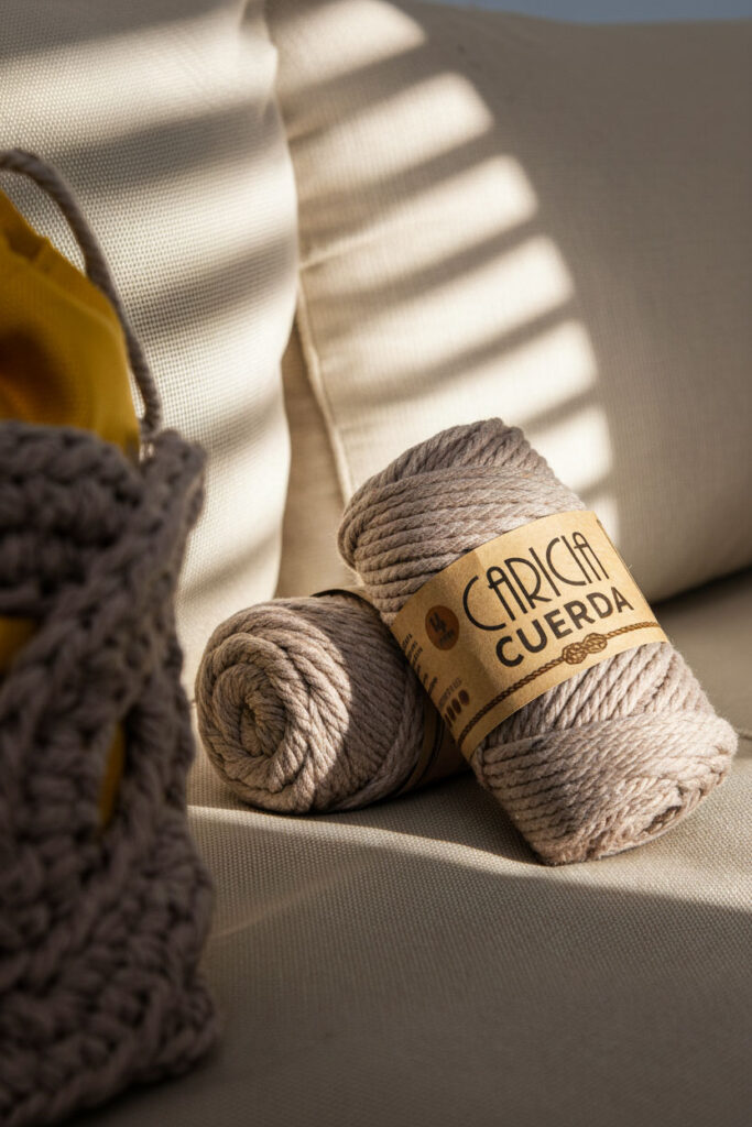 Para bolsos es recomendable usar hilo grueso y resistente, como la Caricia Cuerda, que aporta cuerpo sin necesidad de estructuras internas. También puedes usar cuerda de algodón, yute o materiales reciclados, según el acabado que desees.