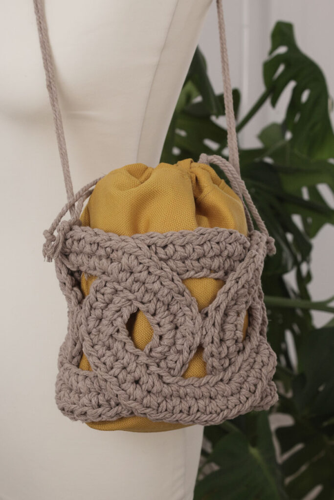 La cuerda textil Caricia aporta rigidez y volumen sin necesidad de estructuras metálicas, lo que simplifica el tejido y da como resultado un bolso robusto, natural y moderno.